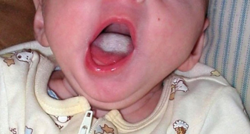 Для заболевания характерно образование плотного, белого творожистого налета или пленочек на языке, деснах по линии смыкания губ. Его количество увеличивается после приема пищи.